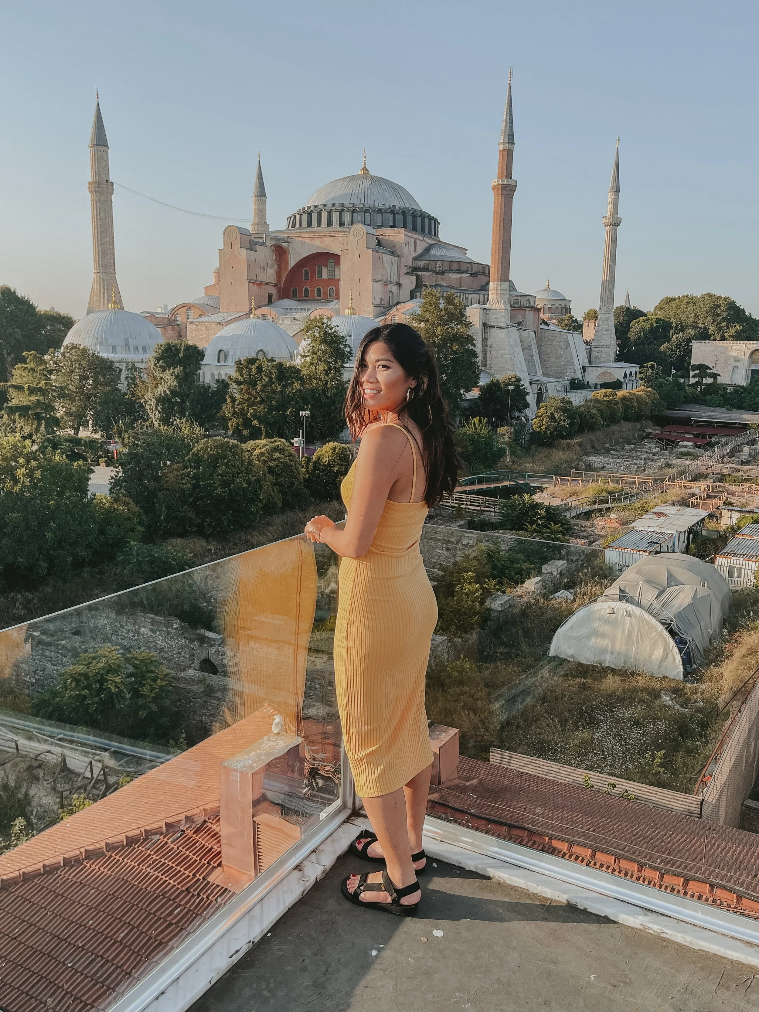 Roof Mezze 360 - get the grilled halloumi cheese! The views are phenomenal up here, and worth stopping for drinks! We came here for golden hour and took in all the lovely views of Hagia Sophia.