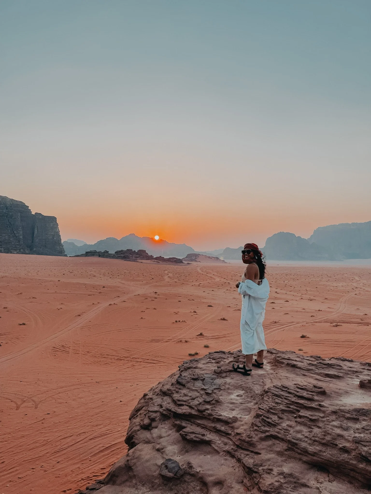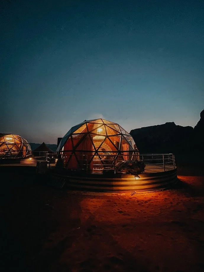 Aicha Bubble Camp - The perfect picturesque luxury camp situated right in Wadi Rum fit for Bedouin royalty. The décor is absolutely fabulous with stunning draped ceilings, metal light fixtures, and antique furniture. At night time, you get panoramic views gazing out at the stars from your glass bubble. We arrived right during golden hour as the sun was setting. The panoramic domes are situated right on the edge of the camp with nothing to look at besides the desert and stars. Customer service was phenomenal, but there is absolutely now WIFI or any signal here. It’s a true unplugged and unwind kind of stay.